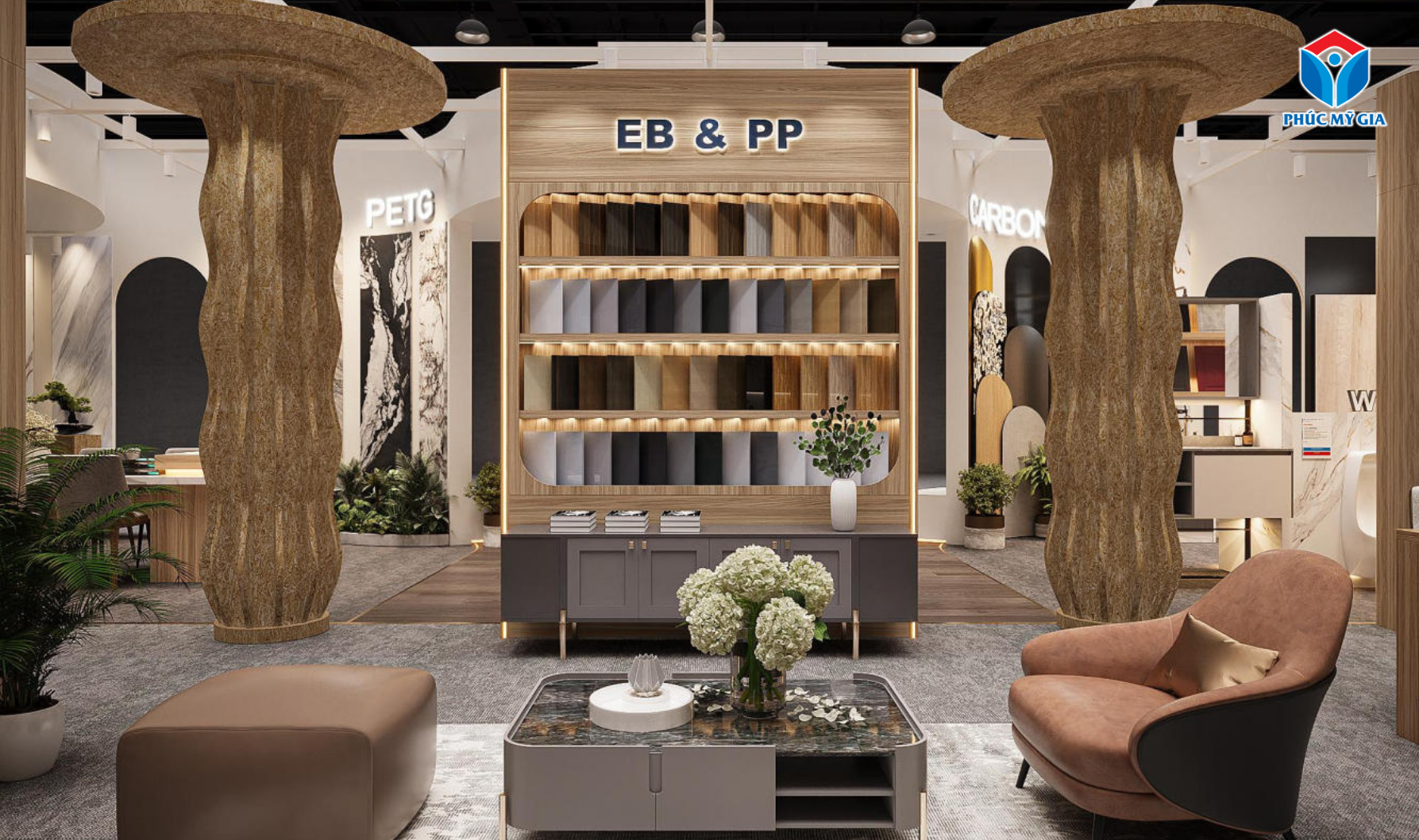 The Phuc My Gia booth showcases a wide range of interior materials and surface finishes, allowing visitors to directly observe and receive consultation.