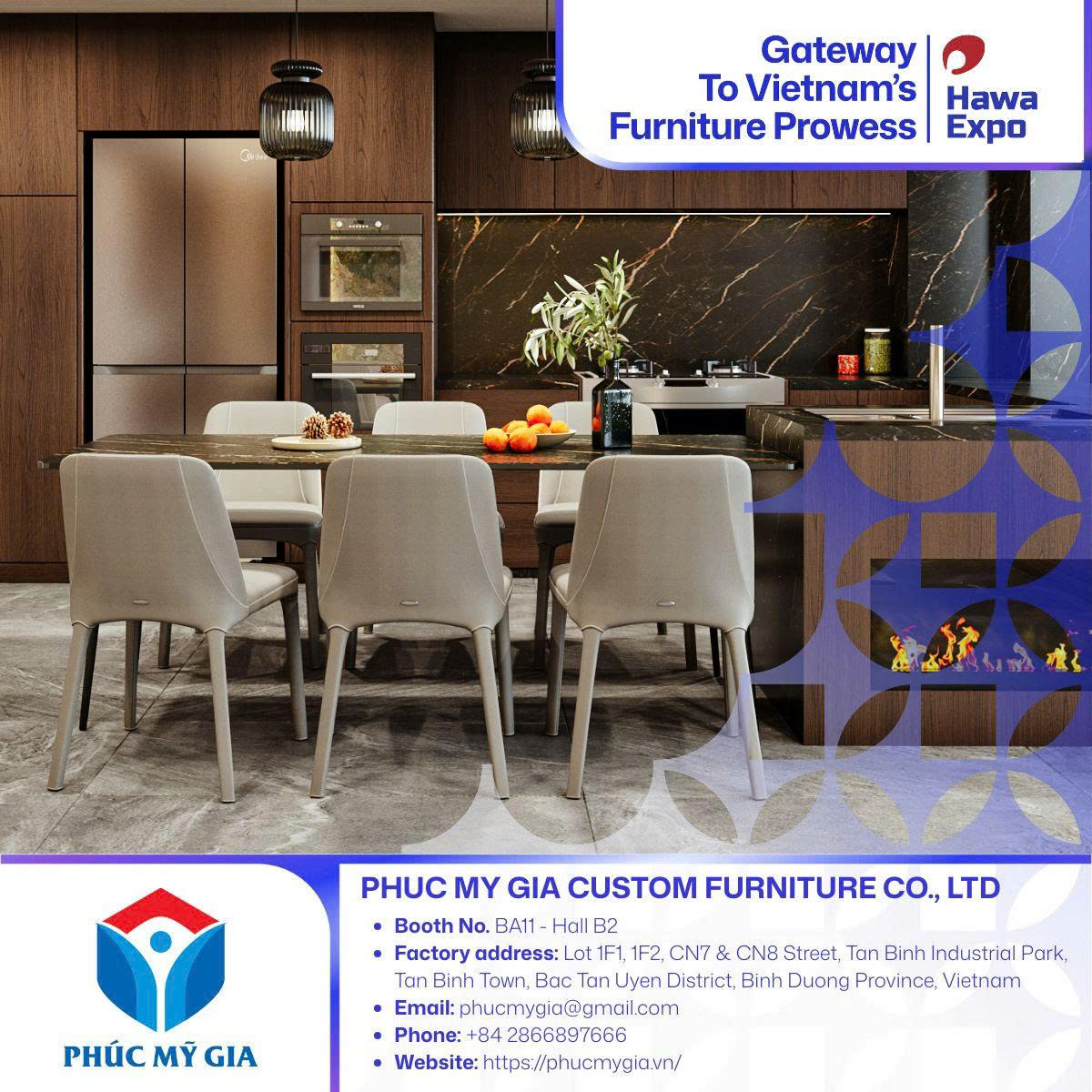 Phuc My Gia warmly welcomes customers, architects, designers, and partners to visit the booth at HawaExpo 2026 to directly experience materials, surfaces, and discuss suitable solutions for each interior project.